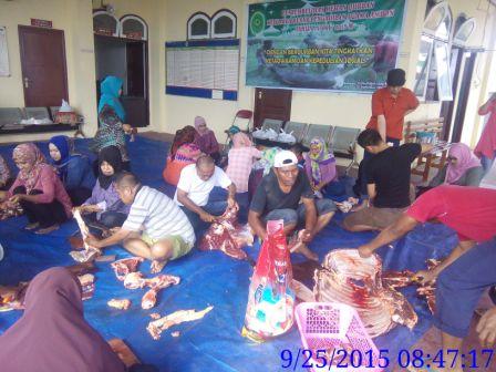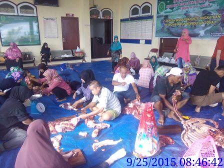 Pejabat maupun Pegawai bahu membahu memotong daging untuk di timbang