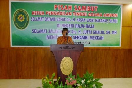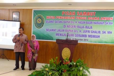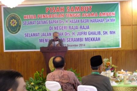 Selanjutnya acara dilanjutkan dengan kesan dan pesan yang disampaikan oleh Drs. H. Djufri Ghalib, S.H., MH diawal pesan dan kesannya beliau menyampaikan permohonan maafnya kalau selama bersama-sama dengan beliau sebagai ayah dan anak atau sebagai abang dan adik adapun terjadi ter-singgungan kata maupun kekhilafan beliau mohon dimaafkan. Kemudian beliau juga memberitahukan bahwa kini PTA. Ambon sudah menandatangani suatu MOU dengan Pemda Maluku dan Kantor Kementerian Agama menyangkut penyelesaian persidangan satu atap mengenai Itsbat Nikah dan Akta Kelahiran Anak. Untuk itu beliau menghimbau kepada para Ketua PA segera ditindaklanjuti supaya ditahun 2015 akan ada sidang terpadu di Daerah-Daerah guna melaksanakan penyelesaian Hukum kepada masyarakat yang kurang mampu. Kemudian beliau juga sampaikan sebagai pengetahuan Ketua PTA. Ambon yang baru bahwa PTA. Ambon juga sudah menandatangani MOU dengan Kantor BPKP dan telah ditindak lanjuti, ini dapat dilihat dari beberapa kali PTA Ambon melaksanakan Audit Keuangan ke Daerah-daerah, perwakilan dari BPKP selalu ikut bersama-sama dengan beliau, Drs. H. Djufri Ghalib, S.H., MH berharap semoga Drs. H. Hasan Basri Harahap, S.H., MH selaku Ketua PTA. Ambon dapat melanjutkan apa yang sudah beliau lakukan.