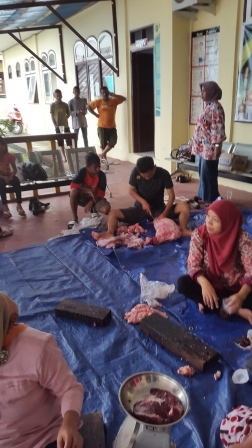 Pejabat maupun Pegawai bahu membahu memotong daging untuk di timbang