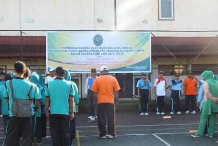 Kamis (21/08/2014), Ketua, Wakil Ketua, Hakim Pejabat Struktural dan Fungsional serta seluruh Pegawai Pengadilan Agama Ambon mengikuti pembukaan kegiatan olah raga yang bertempat di lapangan tenis Pengadilan Tinggi Agama Ambon. Dalam pembukaan tersebut bertindak selaku Pembina adalah Ketua Pengadilan Tinggi Agama Ambon Drs. H. Jufri Ghalib, SH, MH dan Ismail Difinubun S.Ag. MH selaku pemimpin barisan. Pembukaan kegiatan olah raga tersebut juga diikuti oleh Hakim Tinggi, Pejabat struktural dan fungsional serta para Pegawai dari Pengadilan Tinggi Agama Ambon.