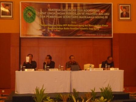 Senin, (21/10/2013) Ketua, Para Hakim, Pejabat Struktural dan Fungsional serta perwakilan dari karyawan/karyawati Pengadilan Agama Ambon mengikuti Pembinaan Sekretaris Mahkamah Agung RI di Hotel Aston Natsepa. Dalam kegiatan itu turut pula di hadiri oleh Ketua dan Wakil Ketua serta Hakim Tingkat Pertama dan Tingkat Banding dari empat lingkungan Peradilan Se-Provinsi Maluku. Kegiatan Pembinaan ini merupakan salah satu rangkaian dari kegiatan Rakerda Gabungan dan Koordinasi Empat Lingkungan Peradilan Se-Provinsi Maluku dan Pembinaan Sekretaris Mahkamah Agung RI. Thema yang diambil kali ini adalah Mempertahankan Status WTP Mahkamah Agung dan Meningkatkan Kinerja demi Terwujudnya Badan Peradilan Indonesia yang Agung.