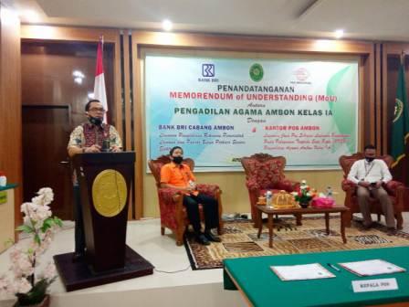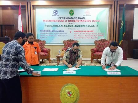 Penandatanganan Memorandum of Understanding (MoU) antara Pengadilan Agama Ambon dengan BRI Cabang Ambon dan Pengadilan Agama Ambon dengan Kantor Pos Ambon.