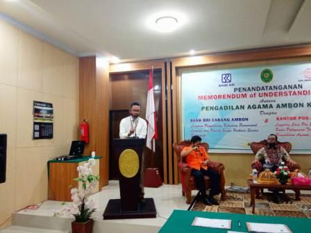 Dalam sambutannya Drs. H. M. Syaukany. M.HI, selaku Ketua Pengadilan Agama Ambon Kelas I A menyampaikan bahwa "dalam kesempatan yang berbahagaia ini, seperti yang telah disampaikan dari pihak Bank BRI dan Kantor POS bahwa ketiga instansi dalam Tupoksi yang berbeda ini dalam hubungannya dengan keuangan dan Pos selama ini sudah berjalan, namun secara tertulis belum dilakukan, maka Allhamdulilah pada hari ini kami dapat melakukan penandatanganan MoU atau Nota Kesepahaman dan berjalan lancar, dan semoga kita semua dapat banyak manfaat – manfaat yang diberikan.“Penandatanganan MoU pada pagi hari ini adalah permulaan dari berbagai inovasi yang selalu, selalu dan akan selalu dicari dan digali dalam rangka mewujudkan layanan publik yang prima kepada para pencari keadilan di Pengadilan Agama Ambon Kelas I A” tutup beliau.