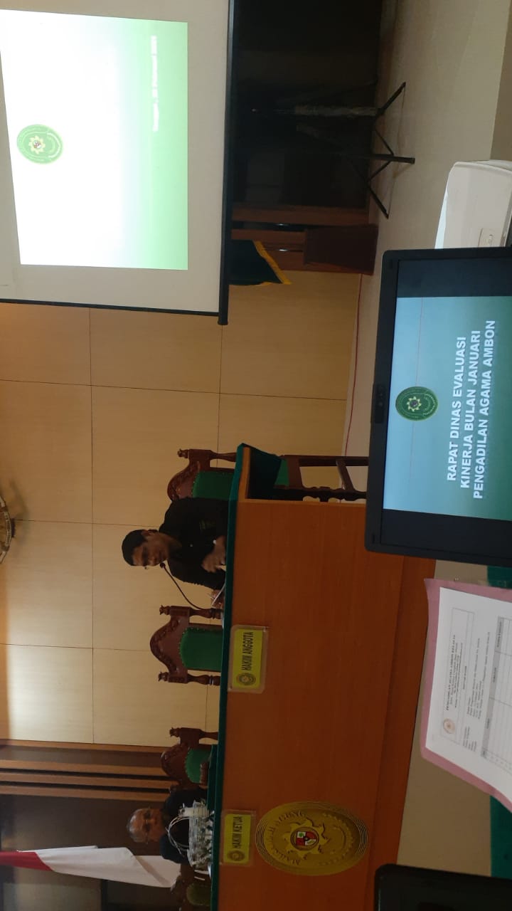 Rapat Evaluasi bulan ini bertujuan sebagai sarana untuk memonitoring sekaligus sebagai alat kontrol dalam memberikan pembinaan terhadap Hakim, ASN dan Tenaga Kontrak dalam pencapaian kinerja bulan Januari 2021 dan dapat memberikan arahan dan saran terhadap berbagai kendala yang dihadapi pada masing-masing bagian yakni dari bagian Kepaniteraan ataupun dari bagian Kesekretariatan serta sebagai sarana sharing terhadap unsur-unsur yang berkaitan dengan administrative yang sedang berjalan di Pengadilan Agama Ambon Kelas I.A