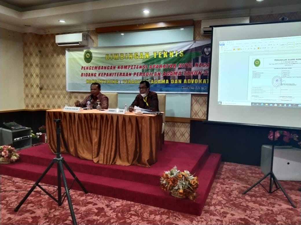 Rabu 7 April 2021, Bertempat di Hotel Marina Ambon pejabat kepaniteraan Pengadilan Agama Ambon yang terdiri dari Drs. Ali Karepesina (Panitera), Rusna Styastuti, S.H., M.H (Panitera Muda Hukum), Drs. Abdul Lamasano (Panitera Muda Gugatan), dan Dahniar Achmad, S.H.I (Kasir) mengikuti Kegiatan Bimbingan Teknis Terpadu yang diselenggrakan oleh Pengadilan Tinggi Agama Ambon dalam rangka Pengembangan Kompetensi Aparatur Sipil Negara Bidang Kepaniteraan Peradilan Agama Tahun 2021.