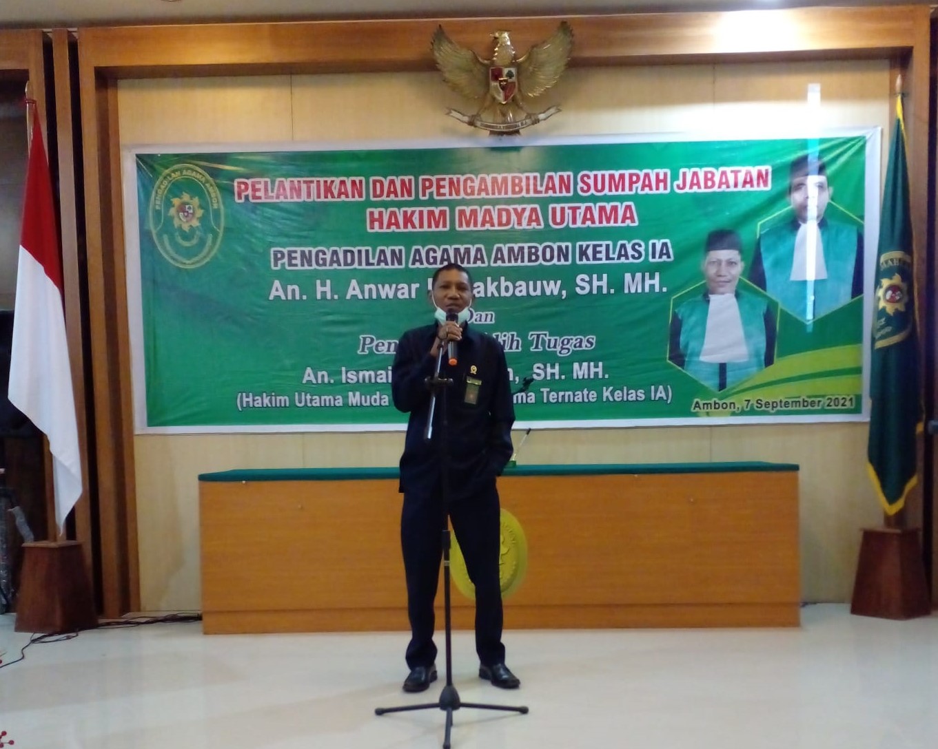 Ambon - Tim IT PA.Ambon : Pada hari Rabu tanggal 07 September 2021 bertepatan dengan 29 Muharram 1443 H pukul 10.10 WIT, Bertempat di ruang sidang utama Pengadilan Agama Ambon Kelas I.A telah dilaksanakan Pelantikan Hakim Pengadilan Agama Ambon yang baru mutasi, sesuai Petikan Keputusan Ketua Mahkamah Agung RI Nomor : 154/KMA/SK/VIII/2021 Tentang Promosi dan Mutasi Hakim an. H. Anwar Rahakbauw S.H.,M,H. dirangkaikan dengan acara Pengantar Alih Tugas, Ismail Warnangan, SH.,MH (Hakim Utama Muda ) yang dimutasikan ke Pengadilan Agama Ternate Kelas I.A. Acara pelantikan dan pengantar alih tugas ini dihadiri oleh seluruh para Pimpinan, para Hakim, Pejabat Fungsional , Pejabat Struktural , seluruh ASN Pengadilan Agama Ambon dan para mahasiwa praktek kerja lapangan dari STIKOM Ambon dan IAIN Ambon.