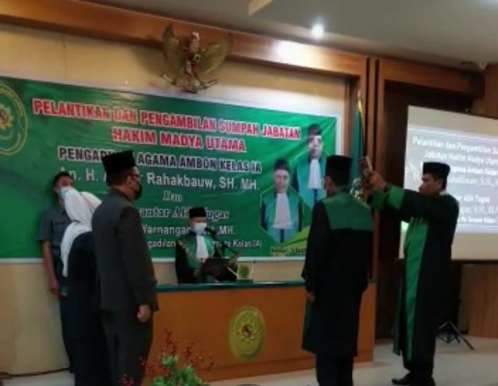 Ketua Pengadilan Agama Ambon Drs. Muh.Mukrim, M.H., melantik dan mengambil sumpah jabatan Hakim yang baru dilantik H. Anwar Rahakbauw S.H.,M,H ( Hakim Madya Utama) yang sebelumnya menjabat sebagai Hakim Pengadilan Agama Jayapura Kelas I.A. Usai pelantikan Ketua Pengadilan Agama Ambon menyampaikan kata sambutan. Dalam sambutannya beliau menyampaikan selamat datang dan selamat bergabung di Pengadilan Agama Ambon untuk hakim yang baru di lantik. sementara harapan beliau kepada pak Ismail Warnangan, SH.,MH (Hakim Utama Muda ) yang dimutasikan ke Pengadilan Agama Ternate Kelas I.A., agar dapat menerapkan apa yang terbaik jika merasa itu yang terbaik. Dan jangan terapkan yang tidak baik, jika merasa itu memang tidak baik serta semoga makin sukses dalam berkarier.