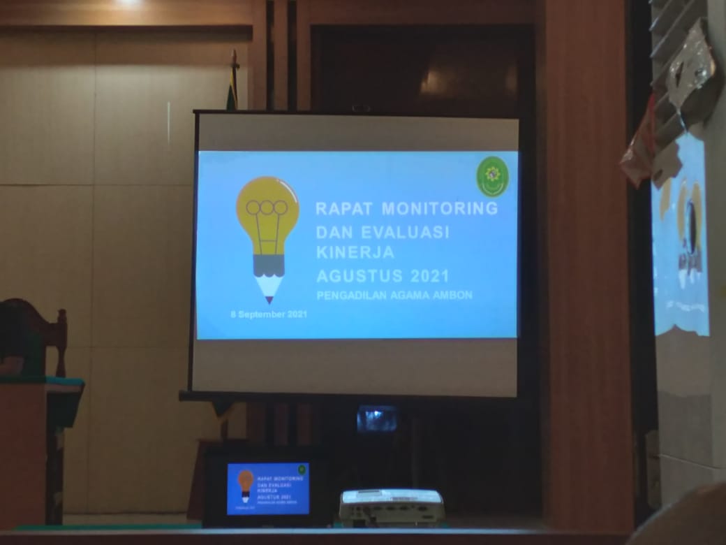 Ambon - 8 September 2021: Bertempat di ruang sidang utama Kantor Pengadilan Agama Ambon Kelas 1 A, telah dilaksanakan rapat monitoring dan evaluasi (Monev) Bulan Agustus 2021, Rapat Monev ini dilaksanakan dengan menerapkan protokol kesehatan di masa pandemi Covid-19. Rapat Monev ini tujuannya agar setiap sub bagian di Kepaniteraan dan Kesekretariatan dapat menyampaikan progres kinerja mereka selama bulan Agustus tahun berjalan. Rapat Monev dihadiri oleh aparatur Pengadilan Agama Ambon Kelas 1 A, mulai dari Wakil Ketua, Panitera, Sekretaris, para Hakim dan Pegawai.