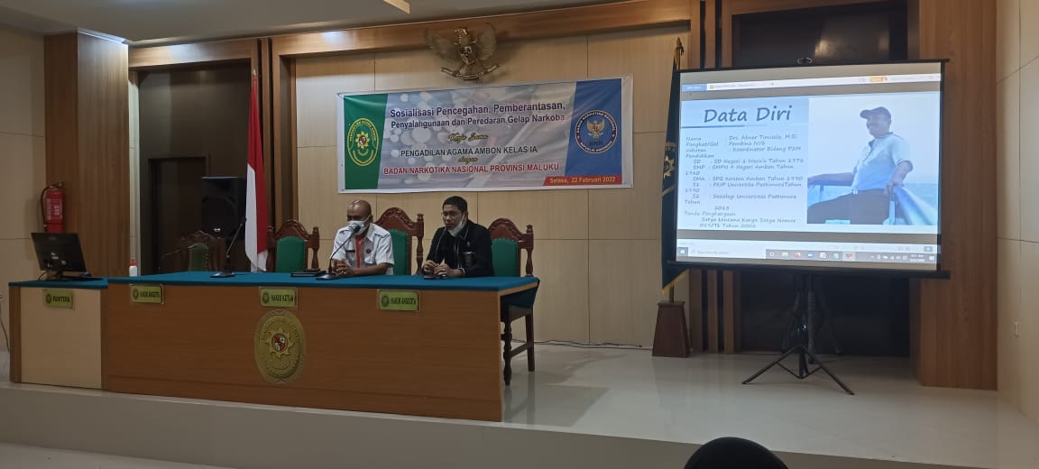 Ambon (22/02) bertempat di Ruang Sidang Utama Pengadilan Agama Ambon pukul 09.00 WIT dilaksanakan Sosialisasi Pencegahan, Pemberantasan, Penyalahgunaan dan Peredaran Narkotika (P4GN) oleh BNN Provinsi Maluku.