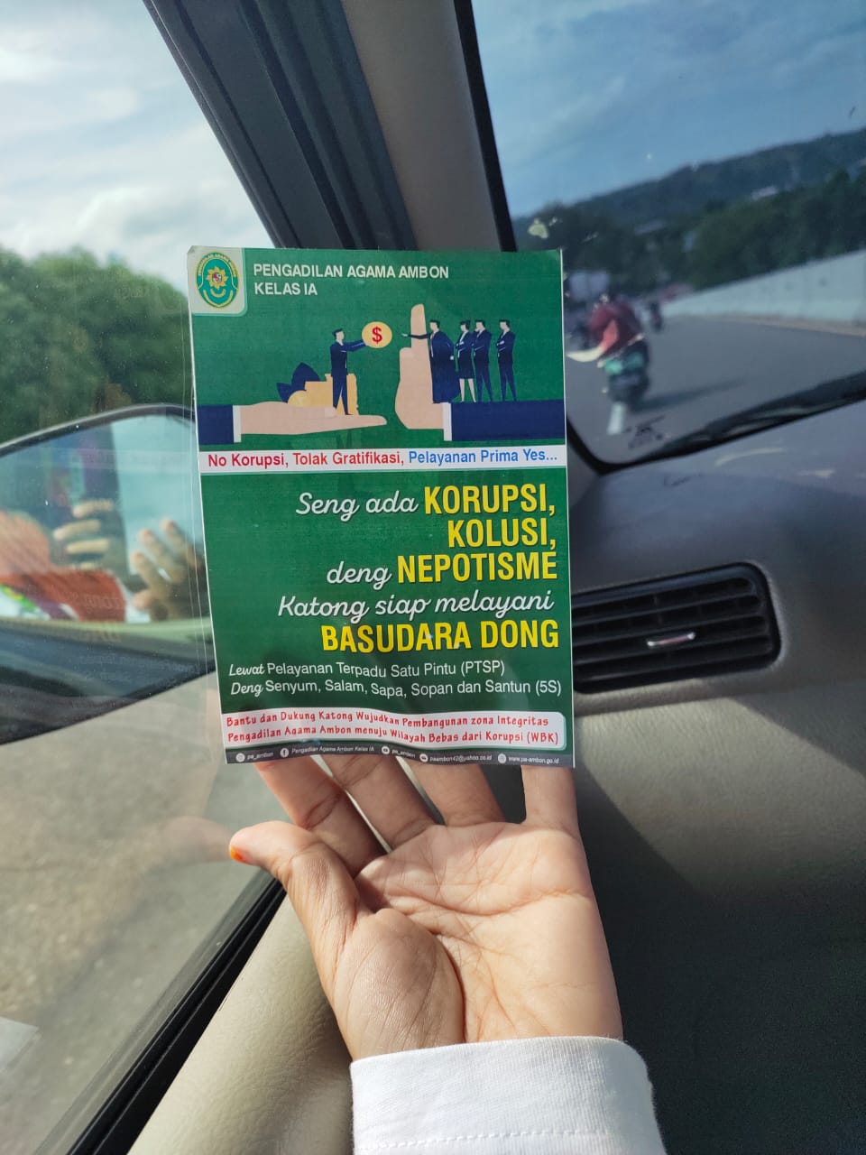 Ambon, 4/3/2022: Seluruh Pimpinan, ASN dan PPNPN Pengadilan Agama Ambon Kelas I.A melaksanakan aksi Public Compaign yang dilaksanakan di dua titik tempat keramaian Kota Ambon, Yakni yang berlokasi di bawah JMP (Jembatan Merah Putih) dan Bundaran Patung Leimena-Poka. Aksi Public Compaign yang dilakukan Pengadilan Agama Ambon ini, tujuannya untuk dapat mewujudkan Zona Integritas menuju WBK/WBBM melalui reformasi birokrasi, khususnya dalam hal pencegahan korupsi, Kolusi, Nepotisme, NO GRATIFIKASI dan peningkatan kualitas pelayanan publik melalui PTSP.