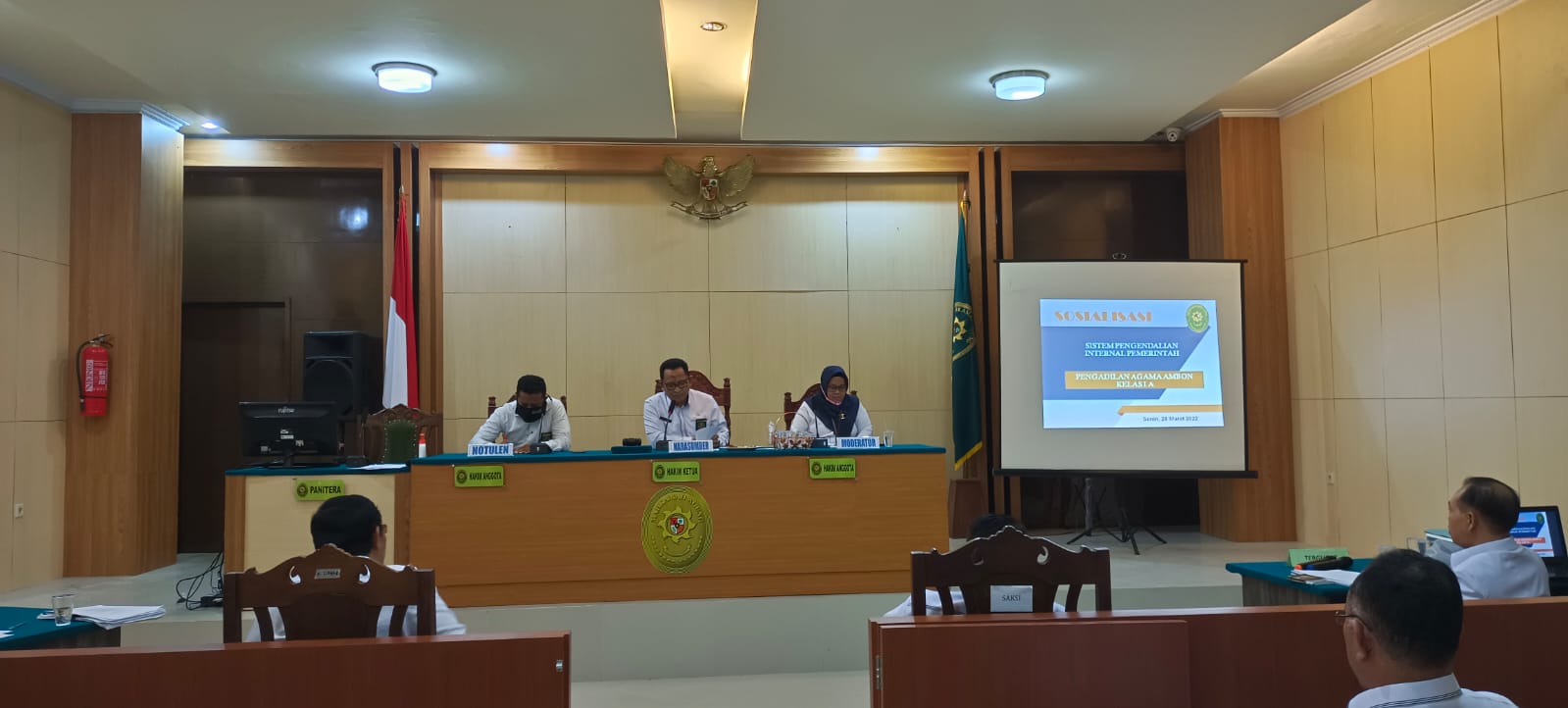 Ambon, Senin(28/3) - Bertempat di Ruang Sidang Utama Kantor Pengadilan Agama Ambon Kelas I.A, telah dilaksanakan Sosialisasi SPIP (Sistem Pengendalian Intern Pemerintah). Acara sosialisasi ini dihadiri oleh Ketua, Panitera, Sekretaris,Hakim, pejabat Fungsional - Struktural dan seluruh ASN dan PPNPN Pengadilan Agama Ambon. Drs. H. Tomi Asram, S.H.,M.H (Hakim PA. Ambon), selaku narasumber SPIP dalam penyampaian materi, beliu menyampaikan bahwa SPIP adalah proses yang integral pada tindakan dan kegiatan yang dilakukan secara terus menerus oleh pimpinan dan seluruh pegawai untuk memberikan keyakinan memadai atas tercapainya tujuan organisasi melalui kegiatan yang efektif dan efisien, keandalan pelaporan keuangan, pengamanan aset negara dan ketaatan terhadap peraturan perundang-undangan.