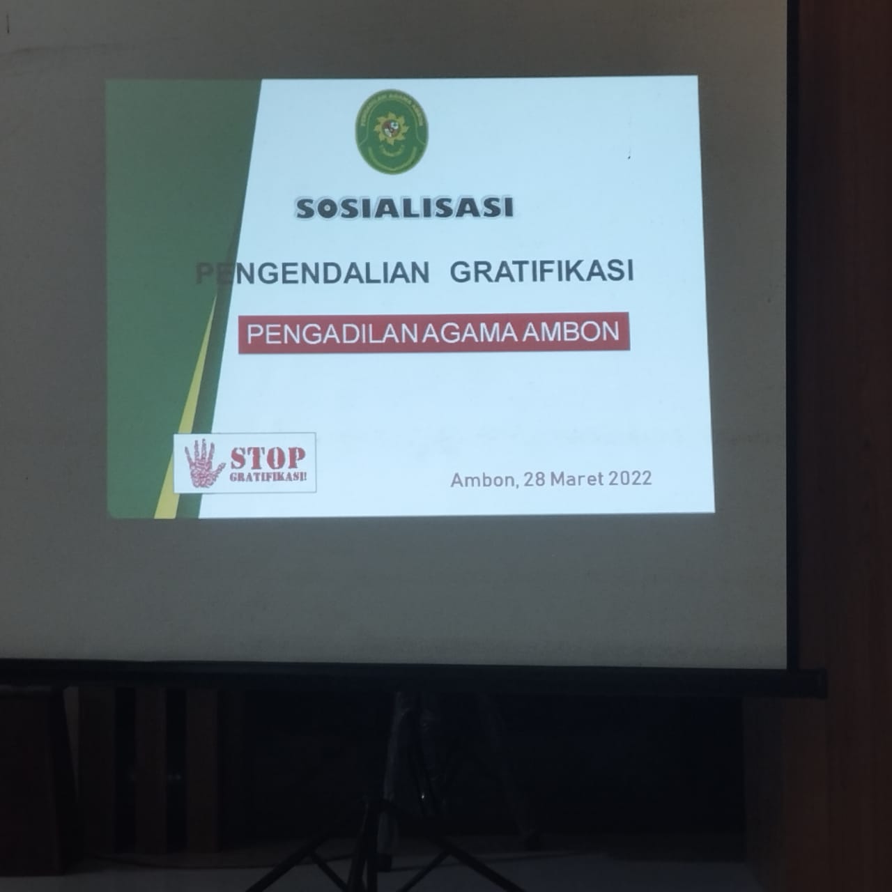 Senin, 28 Maret 2022, bertempat di ruang sidang utama Pengadilan Agama Ambon telah dilaksanakan Sosialisasi Pengendalian Gratifikasi yang diikuti oleh seluruh aparatur Pengadilan Agama Ambon, baik dari unsur pimpinan,hakim, pejabat struktural-fungsional maupun PPNPN dan tenaga honor. Sosialisasi ini merupakan rangkaian kegiatan sosialisasi yang dilaksanakan pada hari tersebut, yang terdiri dari Sosialisasi Kode Etik dan disiplin Hakim/ PNS yang sudah berlangsung sebelumnya dan Sosialisasi Penguatan Pengawasan. Adapun sosialisasi penguatan pengawasan merupakan salah satu unsur yang diwajibkan untuk dilaksanakan dalam pembangunan zona integritas menuju wilayah bebas korupsi oleh kementerian Pendayagunaan Aparatur Negara dan Reformasi Birokrasi.