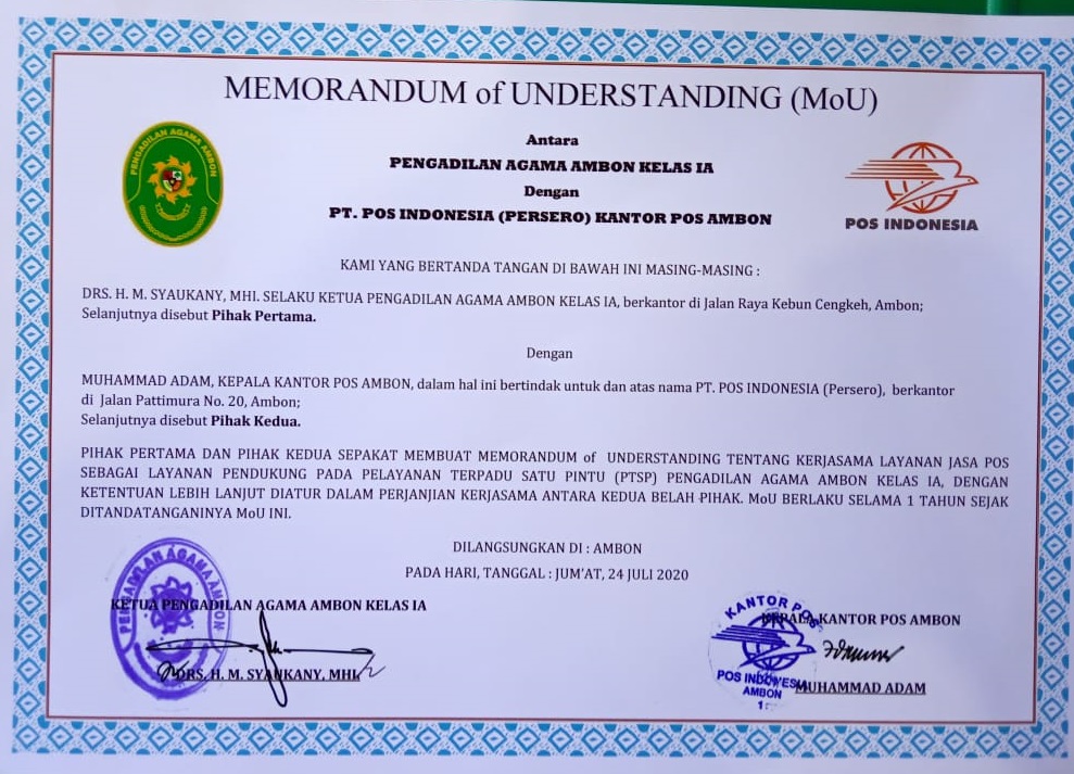 7. MoU PA Ambon dengan PT Pos, Pemerintah Kabupaten Maluku Tengah Dan Kementerian agama kabupaten Maluku Tengah