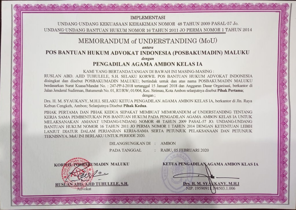 1. MOU dengan POS BANTUAN HUKUM ADVOKAT INDONESIA (POSBAKUMADIN) MALUKU.